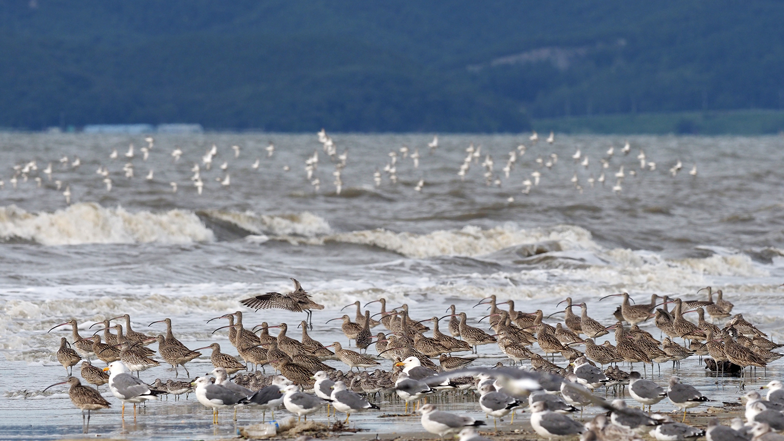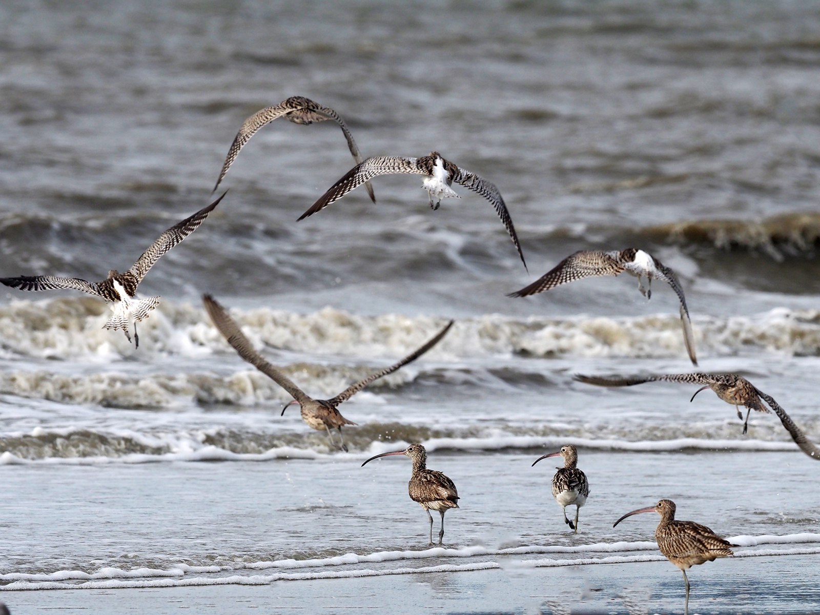 붉은어깨도요 무리에 큰뒷부리도요, 개꿩, 마도요 둥이 드물게 섞여 있다.
