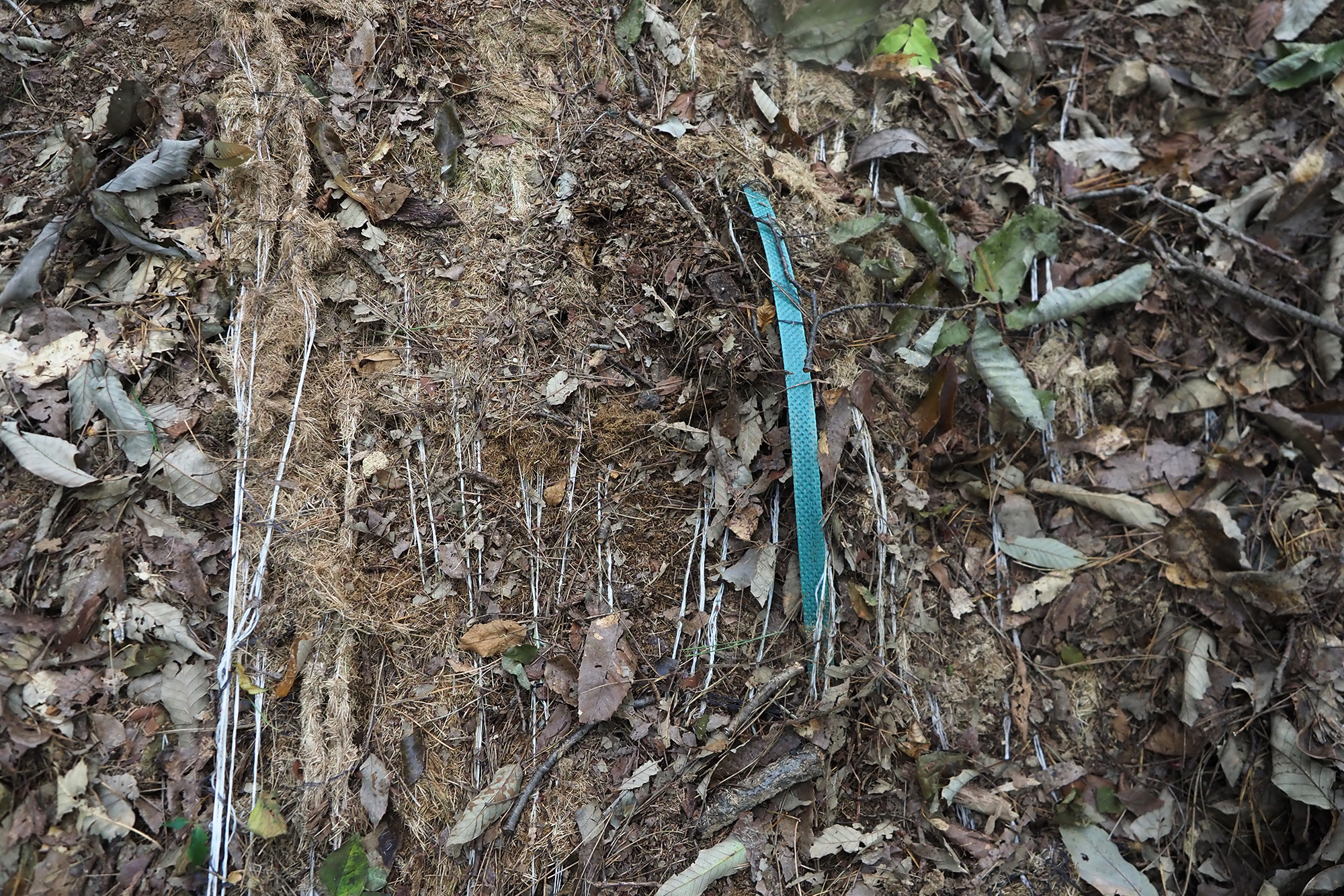 멧돼지가 파헤친 야자 매트의 처참한 몰골, 매트 속 숨어 있던 노끈과 나이롱실이 드러나 산길 여기저기에 널브러져 있다.