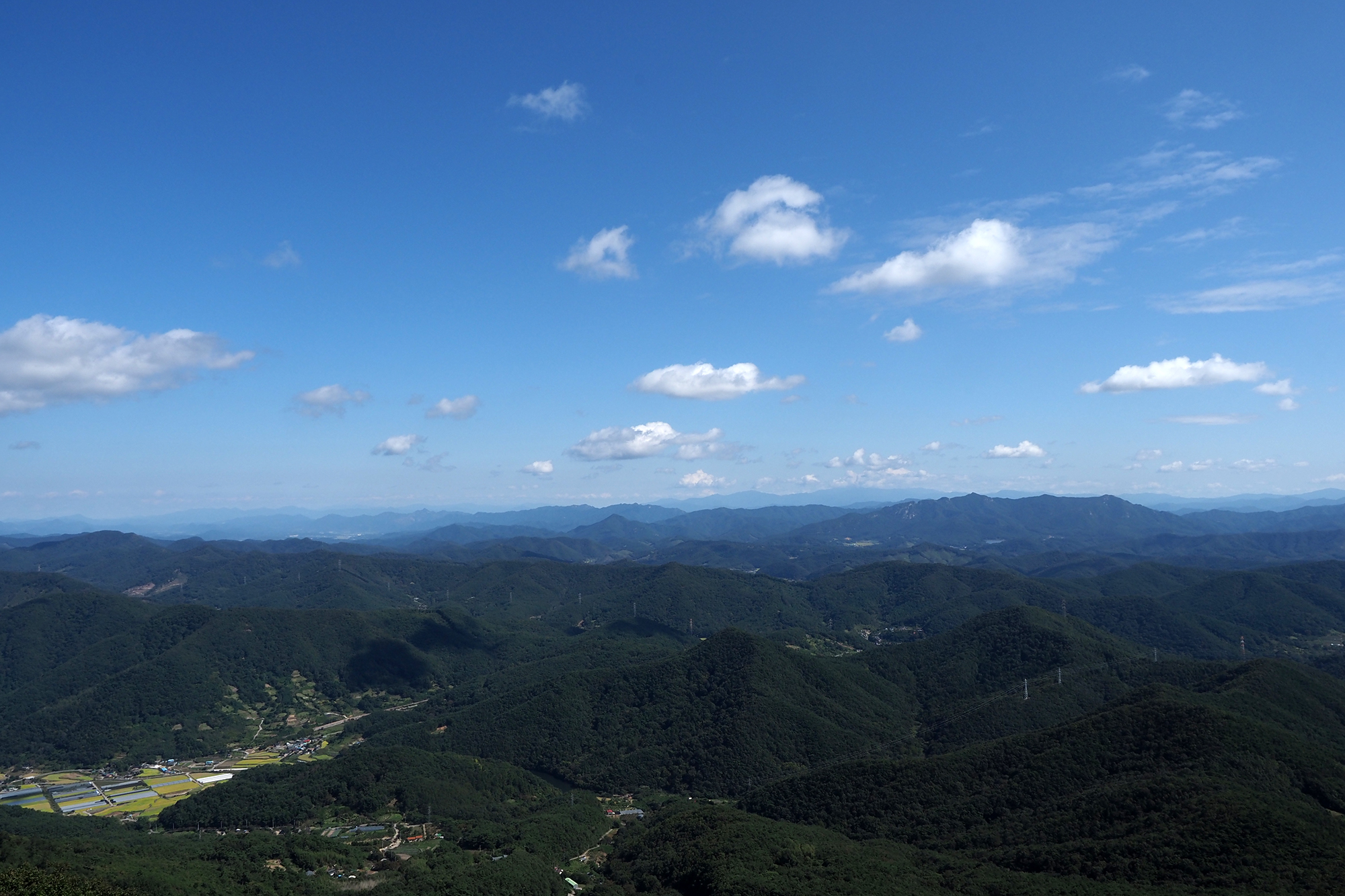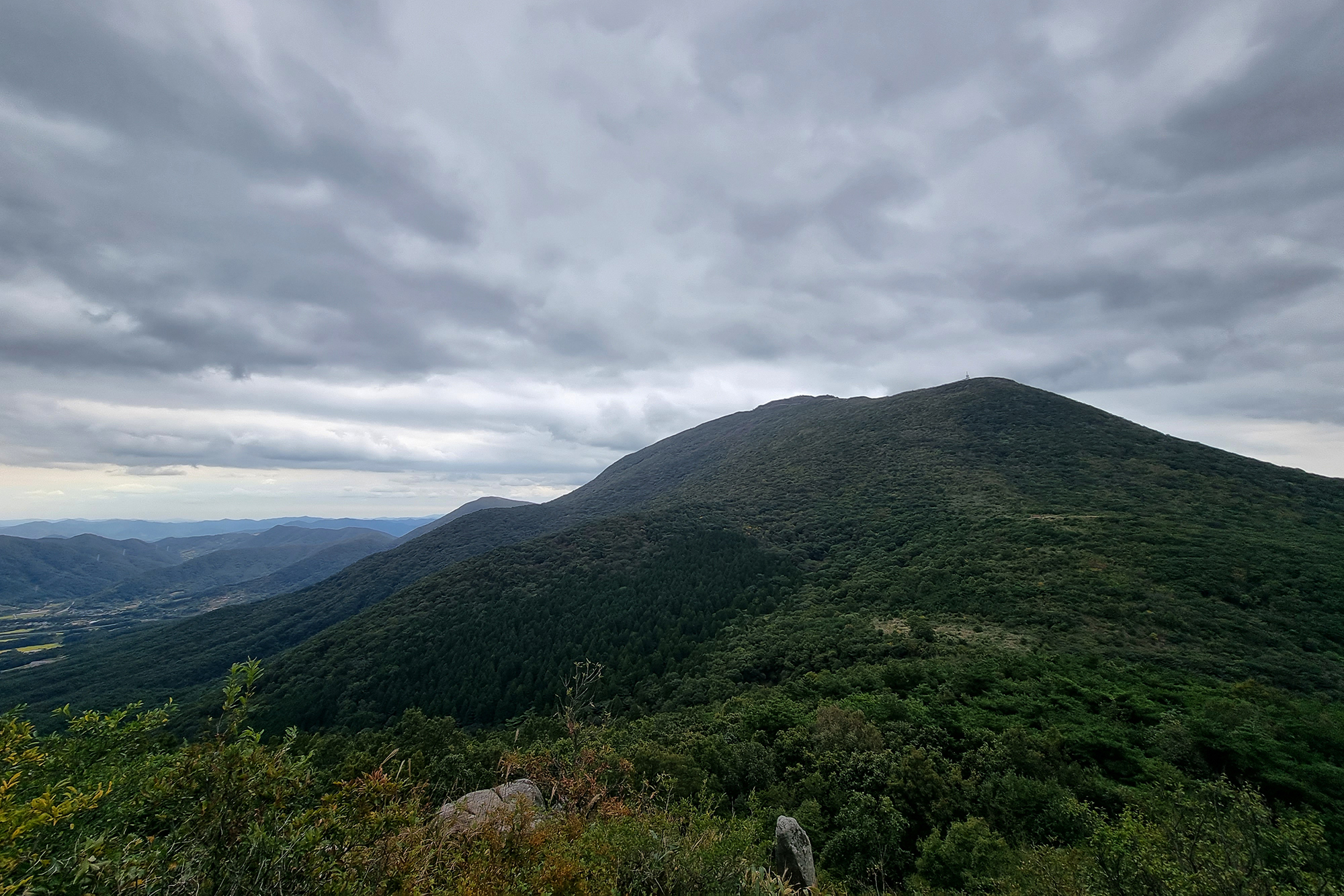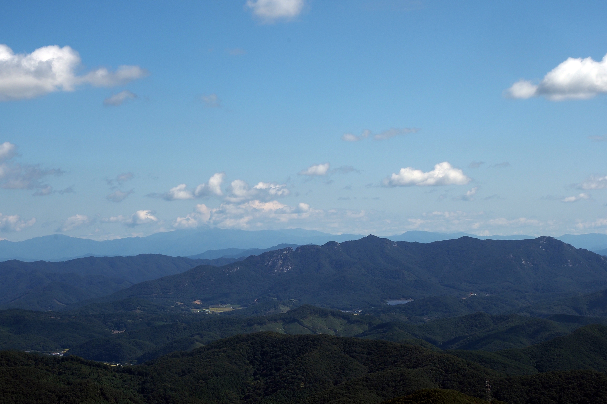 알 수 없는 산들 너머 백아산, 그리고 저 멀리 구름을 이고 있는 지리산. 호남 동남부 일대의 산들이 눈 아래 펼쳐진다.