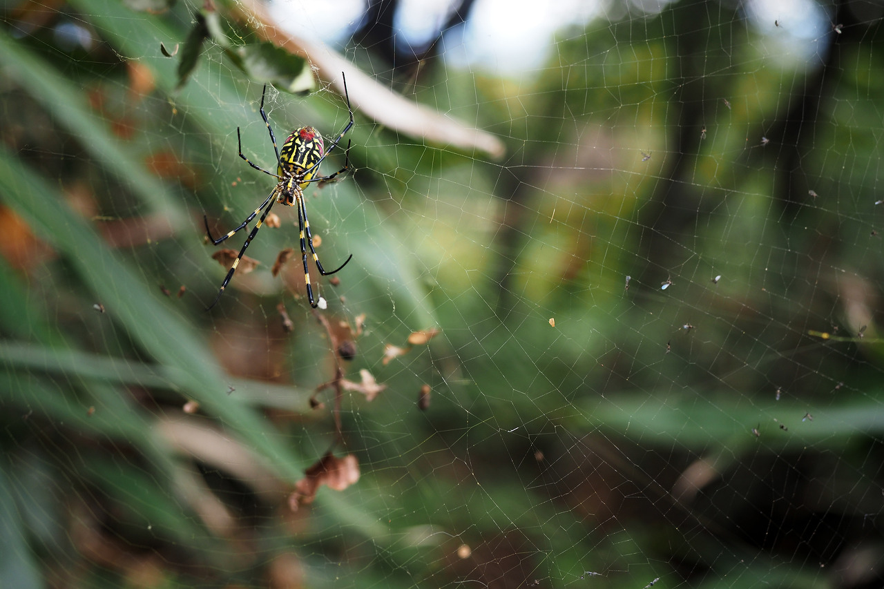 그 끝자락 수문장처럼 길을 막고 있는 무당거미, 손에 쥔 작대기로 거미줄을 걷어내고 전진한다.