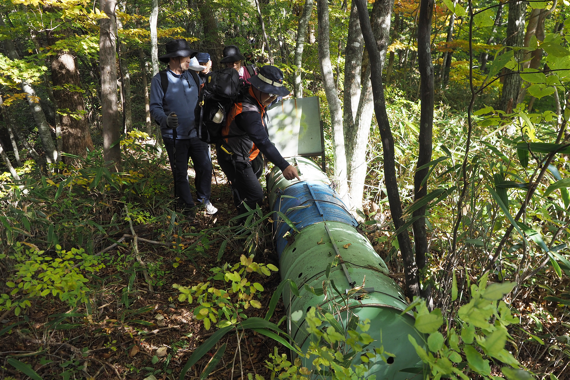 능선에서 만난 멧돼지 덫, 드럼통을 여러 개 이어 만들었다.